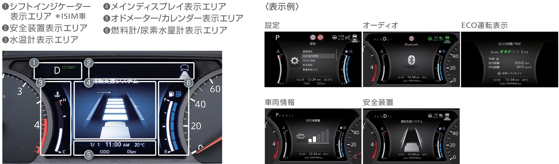 メーターパネルのメーターディスプレイは走行に関するさまざまな情報を表示します。また、画面を切り替えることでメンテナンス情報や時計/日付などの各種設定や、車両情報などを確認することができます。