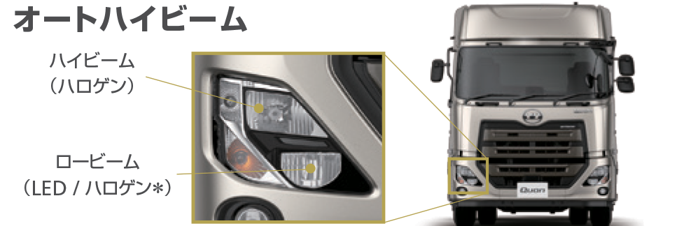 (1) キャブ内カメラが左右の走行車線を検知し、車速50km/h以上で走行中にドライバーが意図せず走行車線から逸脱するとシステムが操舵介入しステアリング操作を支援します。