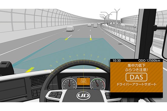 The camera installed inside the cab recognizes the positional relationships between traffic lanes and vehicles, and estimates driver awareness based on steering irregularities. If the driver's concentration drops, a two-step alarm and warning message on the multi-display alert the driver and suggest a break.